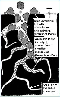 The pores with diameters exceeding 500 A° are called macropores or the transport pores. These pores are larger pores and are not responsible for adsorption directly but they act as wide paths through which organic molecules penetrate. Thus they transport the adsorbate to the adsorption site, which are located inside the particle. A full network of transport pores needs to be distributed through out the carbon particle to take the adsorbate to the smallest adsorption pore site.